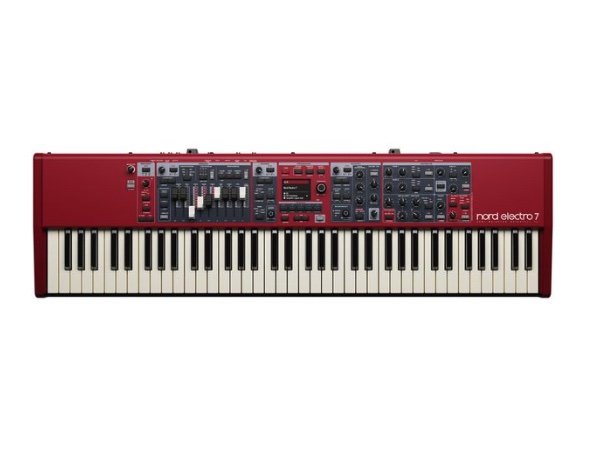 Clavia Nord Electro 7 73; Stage keyboard for live and studio use; semiweighted 73-key waterfall keyboard; three independent sections for piano, organ and synth with split and layer functionality; six freely assignable split points with LED indicators; large color display; program section with Live Mode, set list function and push encoder for fast program selection; seamless transitions when changing programs; organ section based on the Nord Organ 3 (B3, B3 Bass, Vox, Farfisa, Soft B3 and Pipe Organ models); rotary speaker simulation with selectable microphone positions, slow/fast/stop; dual organ mode for quick access to dual manual setups; drawbar live mode and presets for upper and lower manual; physical drawbars with LED indicators; mounting for optional Nord half-moon switch (item 117159, not included); piano section compatible with the Nord Piano Library; dynamic compression and unison function; push encoder for sound and category selection; synth section with sample playback, classic waveforms and FM synthesis (compatible with the Nord Sample Library); mono and legato modes with glide as well as unison function; ADR envelopes for amp and filter; lowpass filter with resonance; effects section with dedicated effects per section; two modulation effects (tremolo, wah, ring modulator, chorus, flanger, phaser, ensemble and more); delay with tap tempo, analog simulation, switchable filter and ping-pong mode; amp section with five amp models, drive and 3-band equalizer; compressor assignable per section or globally; global reverb effect with optional send per layer; all effects in stereo; Stereo line out (2x 6.3mm jack); stereo headphones output (6.3mm jack); monitor input (3.5mm stereo jack); sustain and expression pedal inputs (6.3mm jack); rotary speaker/half-moon switc0h input (6.3mm jack); MIDI in/out (5-pin DIN); USB-B port; dimensions (WxDxH): 1066 x 307 x 104 mm; weight: 9.7 kg